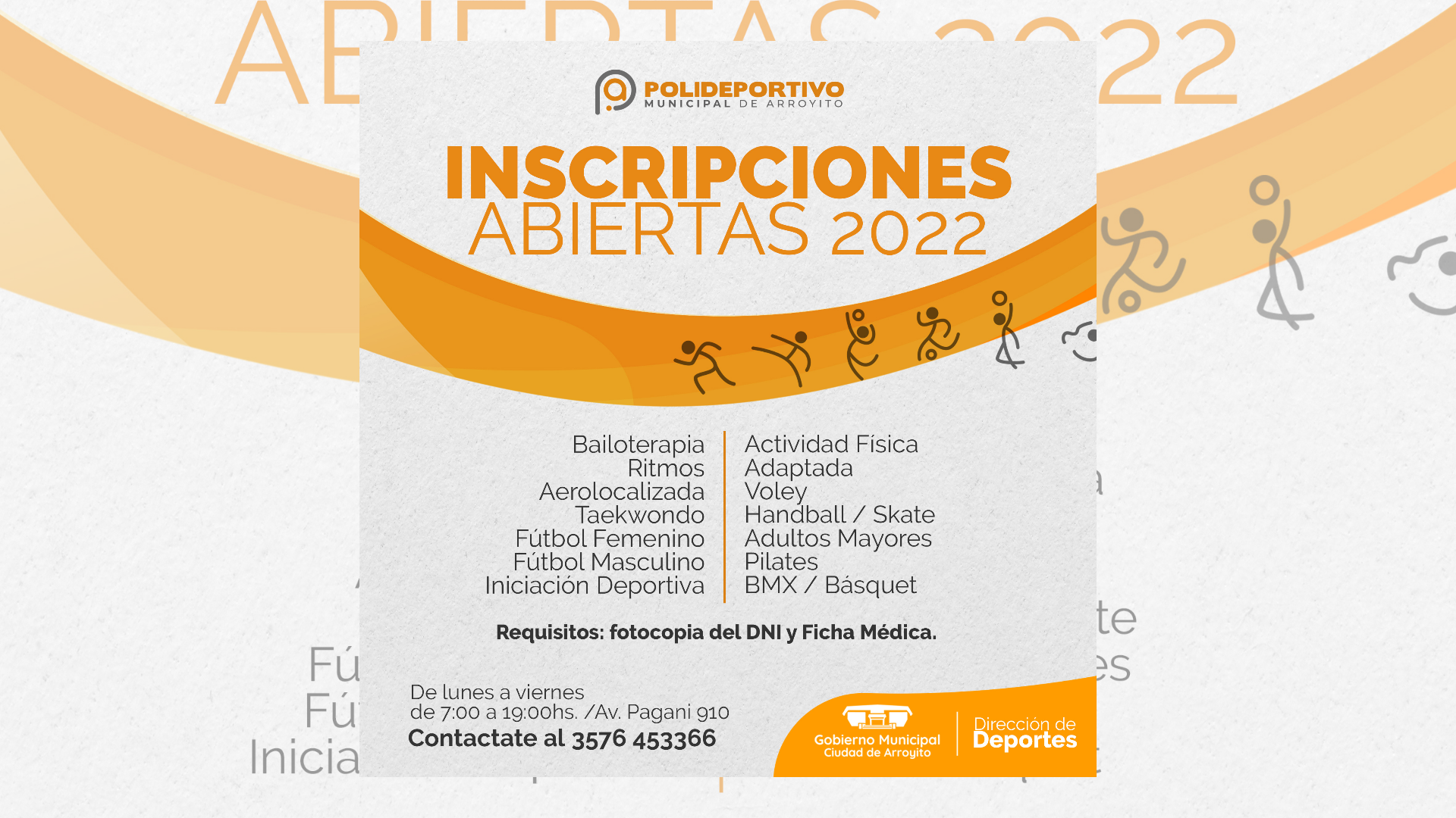 La Dirección de Deportes de Arroyito informó que se encuentran abiertas las inscripciones para las actividades deportivas 2022, las cuales darán inicio el lunes 07 de marzo.