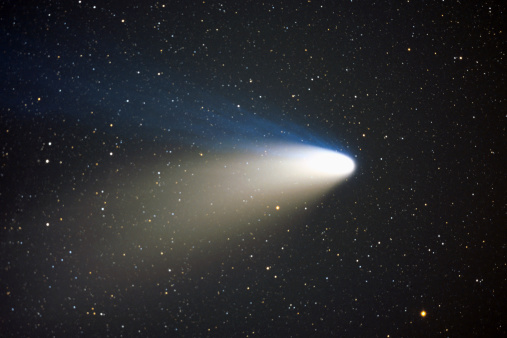 Cuando un cometa pasa cerca del sol, el hielo que contiene su núcleo pasa al estado gaseoso y suelta una larga cola que refleja la luz de la estrella de fuego.