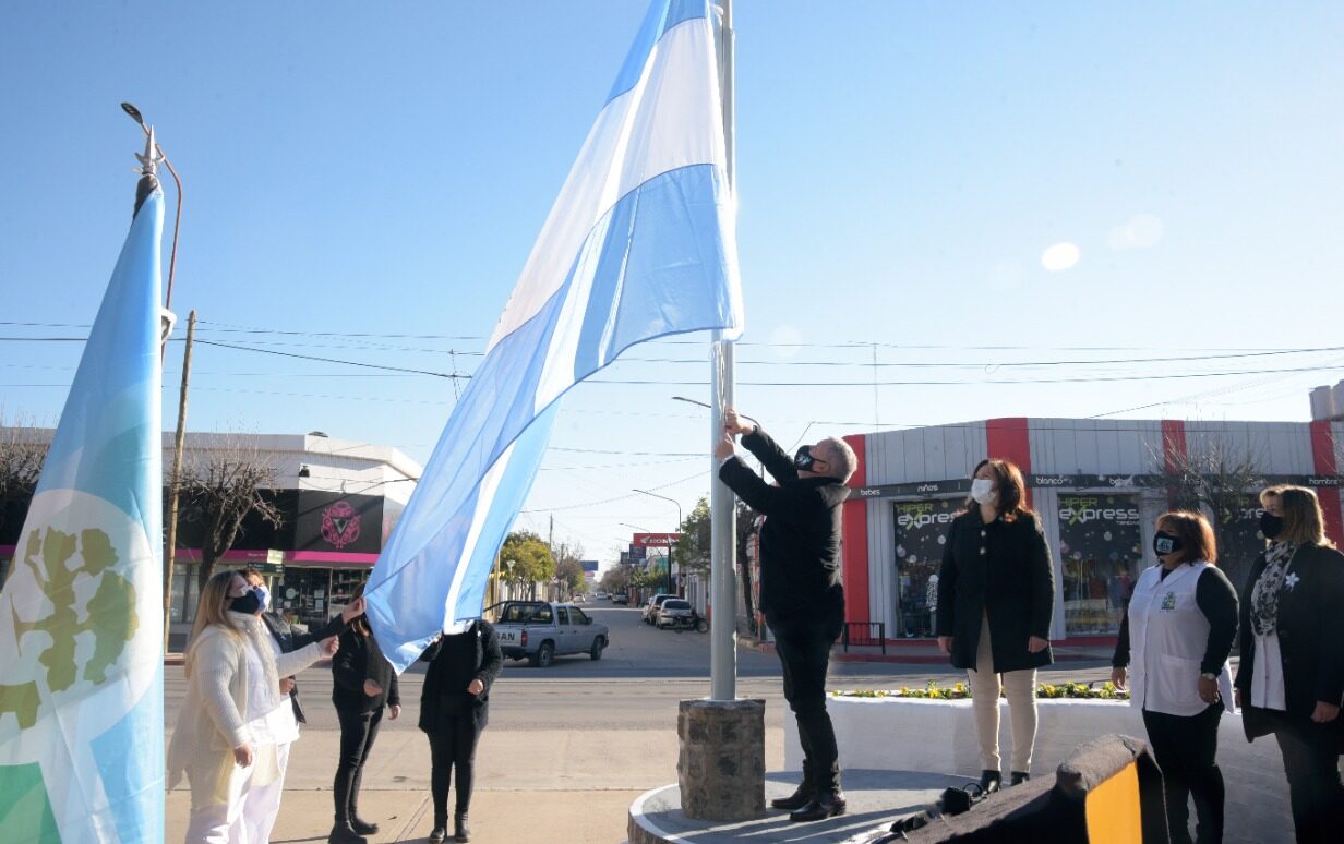 La Viceintendente María José Espósito, junto al cuerpo de Concejales, Comisario Bosco y miembros de Policía, Bomberos Voluntarios Arroyito, autoridades municipales e integrantes de diversas instituciones, médicos de la Clínica Regional, realizaron el izamiento en la Plaza 25 de Mayo.