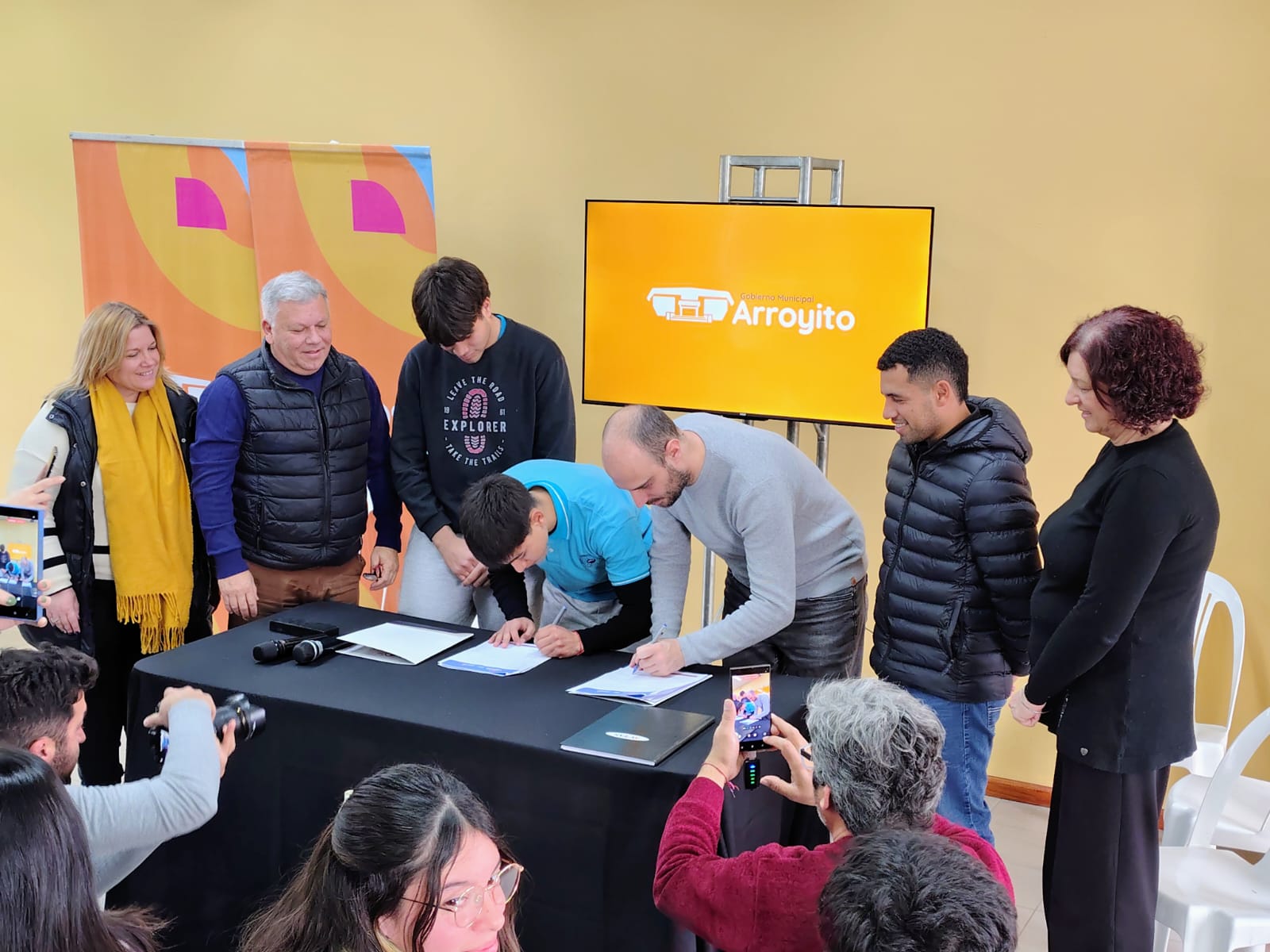 El intendente de Arroyito, Gustavo Benedetti, acompañado de su equipo y el presidente de la Agencia Córdoba Joven, José Ignacio Scotto, firmaron en la mañana de hoy el convenio del Programa “Estudiantes al Centro”, junto a jóvenes de la ciudad.