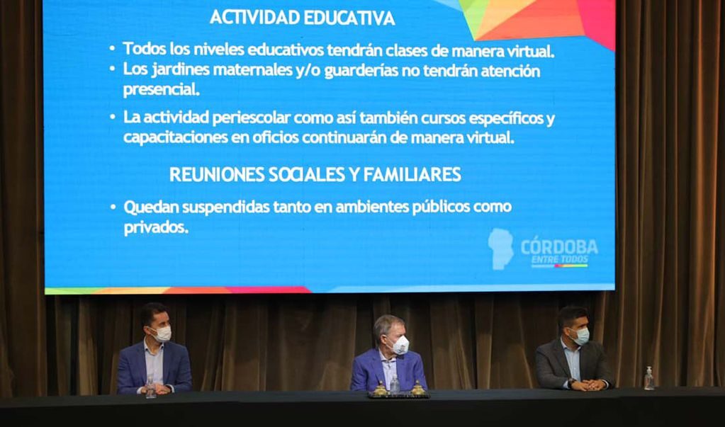 Como parte de las medidas, se estableció que este sábado y domingo, 5 y 6 de junio, Córdoba adhiere al DNU con las restricciones de circulación dispuestas por la Nación. En tanto, desde el lunes 7 de junio y hasta el viernes 18 de junio, Córdoba no tendrá presencialidad en las aulas, el transporte será solo para esenciales y quedarán prohibidas las reuniones sociales a fin de bajar la circulación.