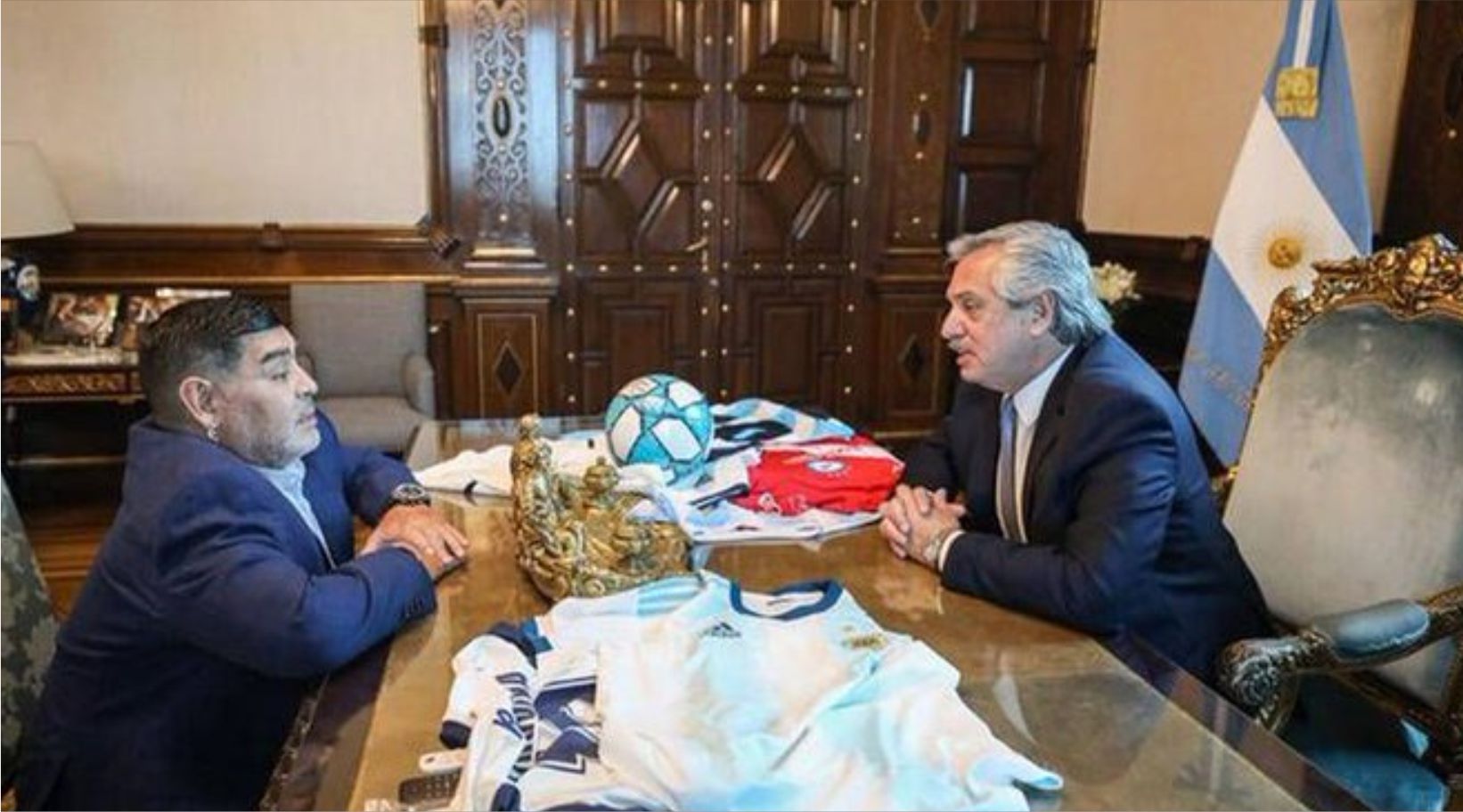 Tras la reunión, el técnico de Gimnasia La Plata salió al balcón de la Casa Rosada junto a una réplica de la Copa del Mundo y revivió el histórico saludo de 1986, tras ganar el Mundial de México, junto Raúl Alfonsín.  Maradona y Fernández hablaron por teléfono el pasado 14 de diciembre, según publicó en Instagram el propio Diego.