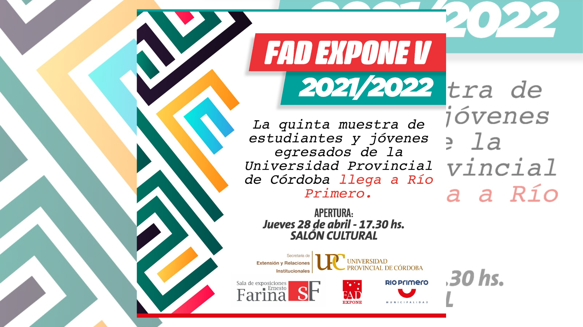 Este jueves 28 de abril, a las 17:30hs en la Sala Fernando Fader del Salón Cultural de Río Primero se inaugura la muestra «FAD EXPONE V» con obras de estudiantes y jóvenes egresados de la Facultad de Artes Visuales y Diseño de la Universidad Provincial de Córdoba.