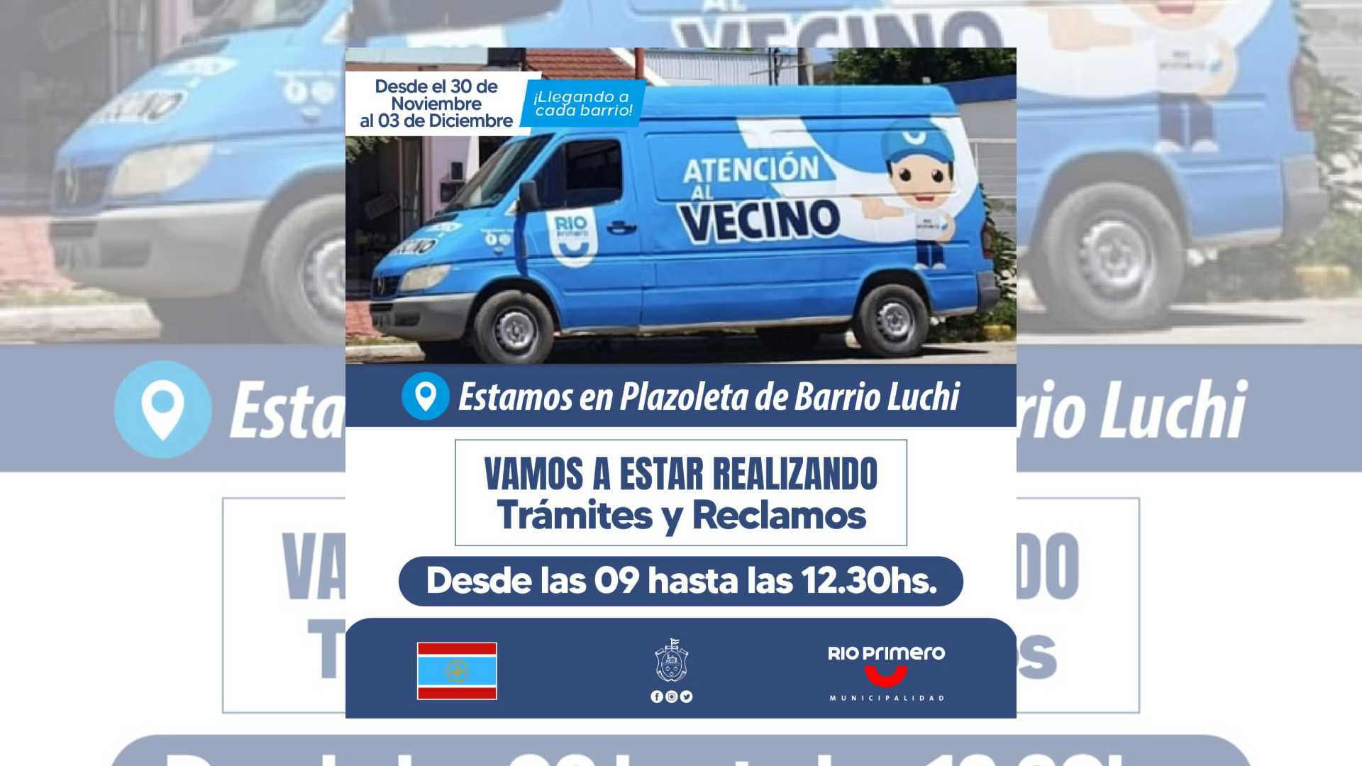 El muni móvil de Río Primero, va a estar realizando Atención al Vecino en la Plazoleta de Barrio Luchi hasta el 3 de diciembre. Comenzó el día de hoy y se reciben todo tipo de trámites y reclamos.