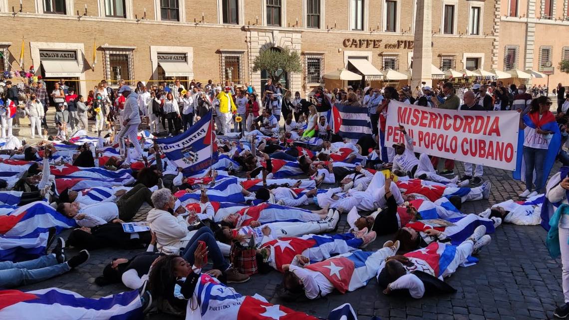 Cubanos que residen en Italia se concentraron el domingo en las puertas del Vaticano como una muestra de respaldo a la convocatoria a una gran movilización contra el régimen castrista prevista para el 15 de noviembre en Cuba.