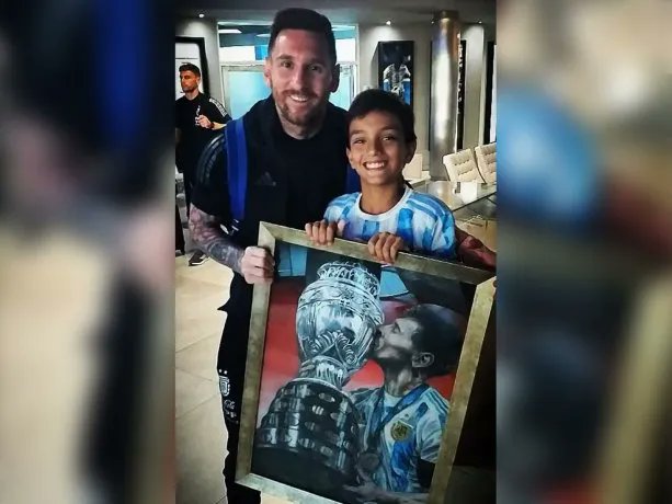 Juani Méndez cumplió su sueño de conocer a Lionel Messi y le regalo un cuadro del jugador besando la Copa América que dibujo el mismo.