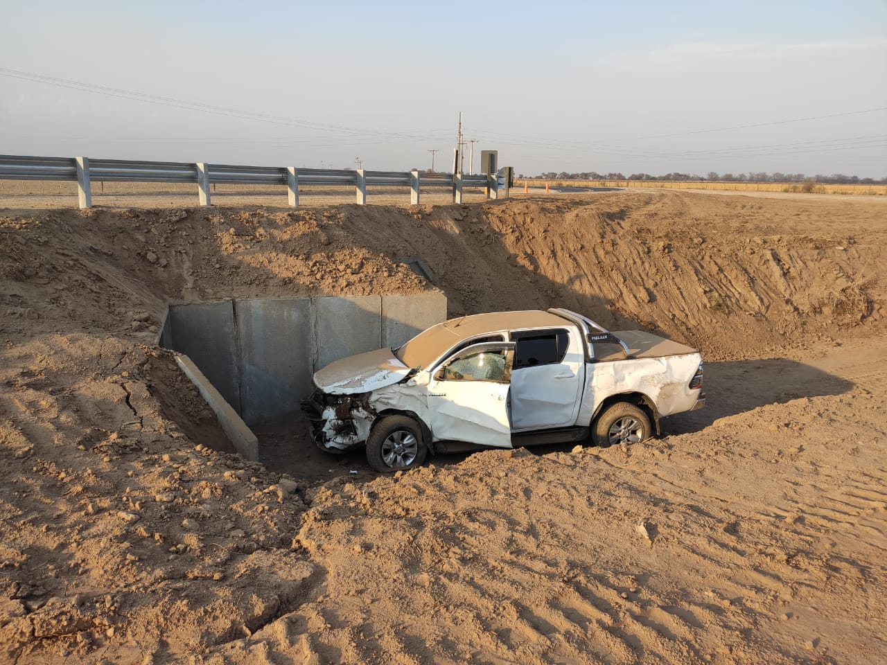 Se trata de una pick up Toyota Hilux color blanca que perdió el control en el ingreso a la localidad de Santiago Temple. El conductor fue trasladado hacia el Hospital de Villa del Rosario para una mejor valoración.