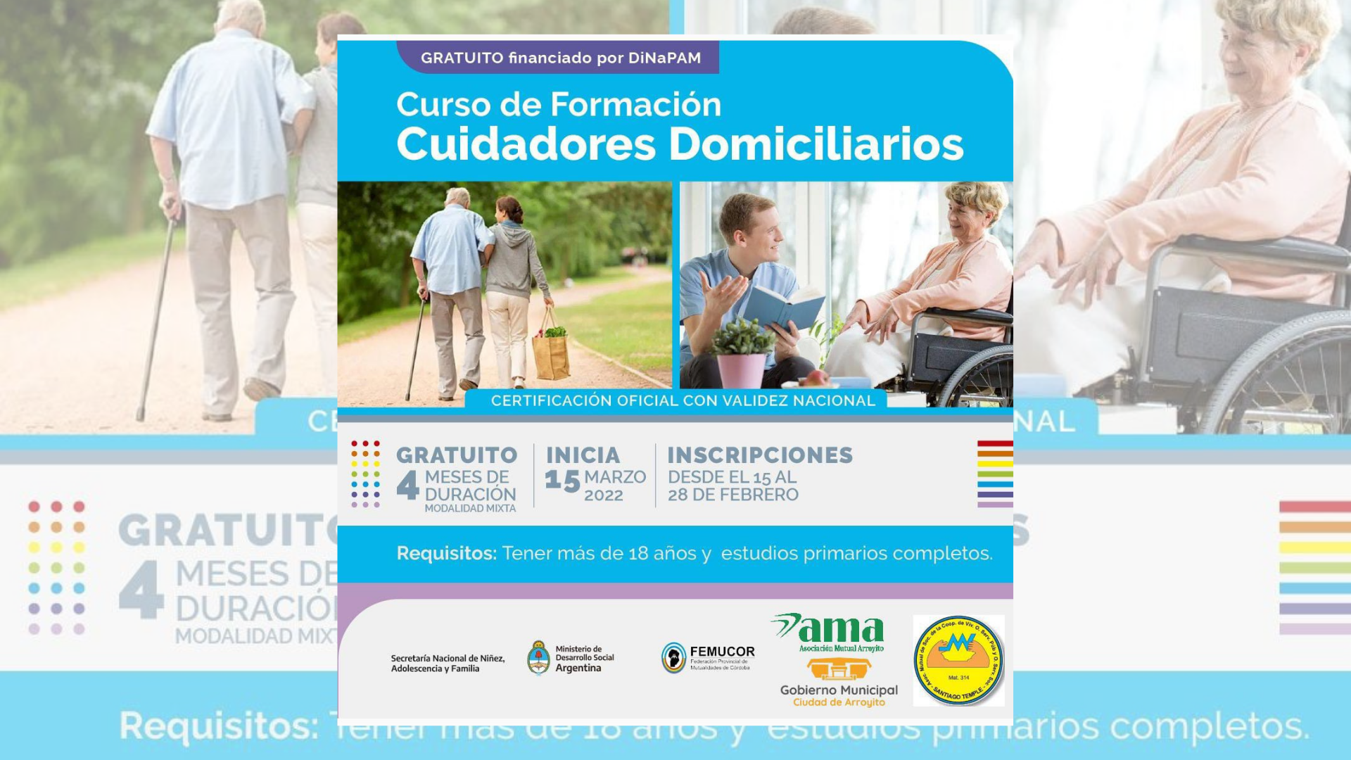 En la ciudad de Arroyito, la Municipalidad junto a la Asociación Mutual Arroyito y la Asociación Mutual de Socios Cooperativa de Viviendas, Obras y Servicios Públicos y Sociales de Santiago Temple LTDA, atentos a los cuidados de la tercera edad, llevarán a cabo por primera vez el Curso de Formación de Cuidadores/as Domiciliarios/as.