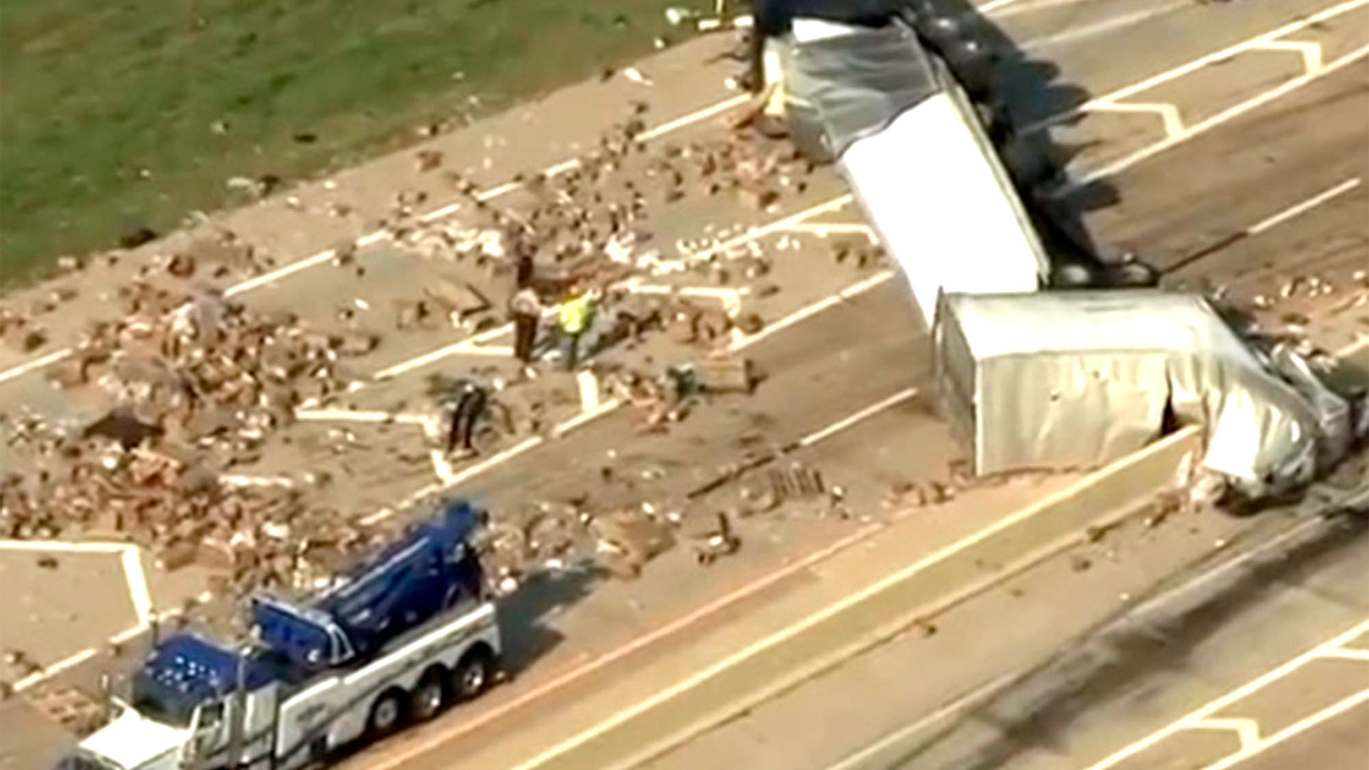 «Un semirremolque volcó y perdió su carga aquí. También se vio involucrado un camión de caja un poco más al este», dijo un periodista del canal.
