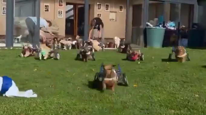 En un video se puede ver a los animales disfrutando en el patio de su nuevo hogar, algunos con sillas de ruedas adaptadas, moviendo sus colitas y jugando con alegría.