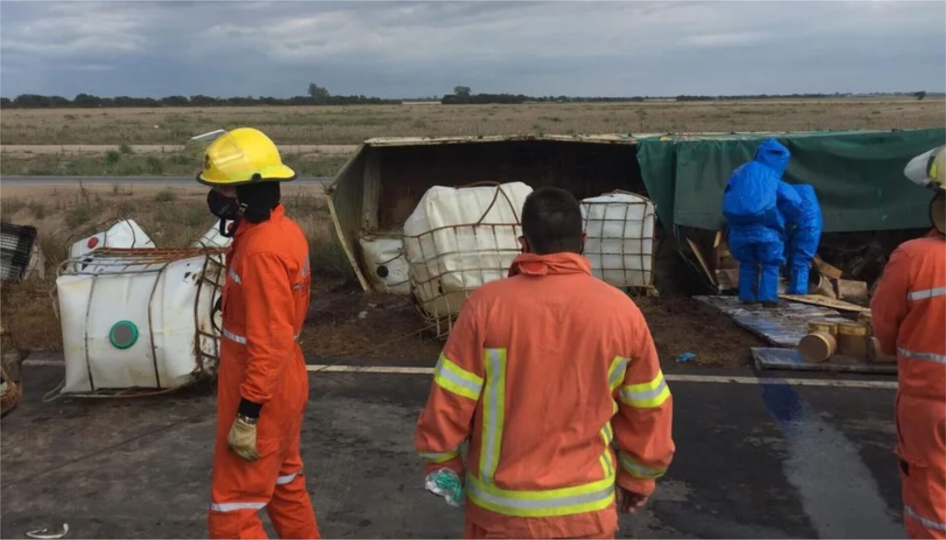 La Policía Caminera debió realizar un corte total en la calzada para facilitar la tarea de los Bomberos Voluntarios de Monte Cristo, que removieron el acoplado y las sustancias químicas que se desparramaron a raíz del accidente.
